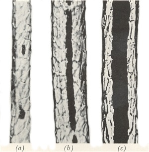 Medullated fibres are characterised by a medulla or a hollow core. This may extend for a considerable length along the fibre or may consist of a number of discrete hollow areas along the fibre. Medullated fibres appear chalky because light is reflected from the inner wall. They are a problem in fabrics because their dye update is different from non-medullated fibres and as a consequence they cause a visible defect in the fabric.
